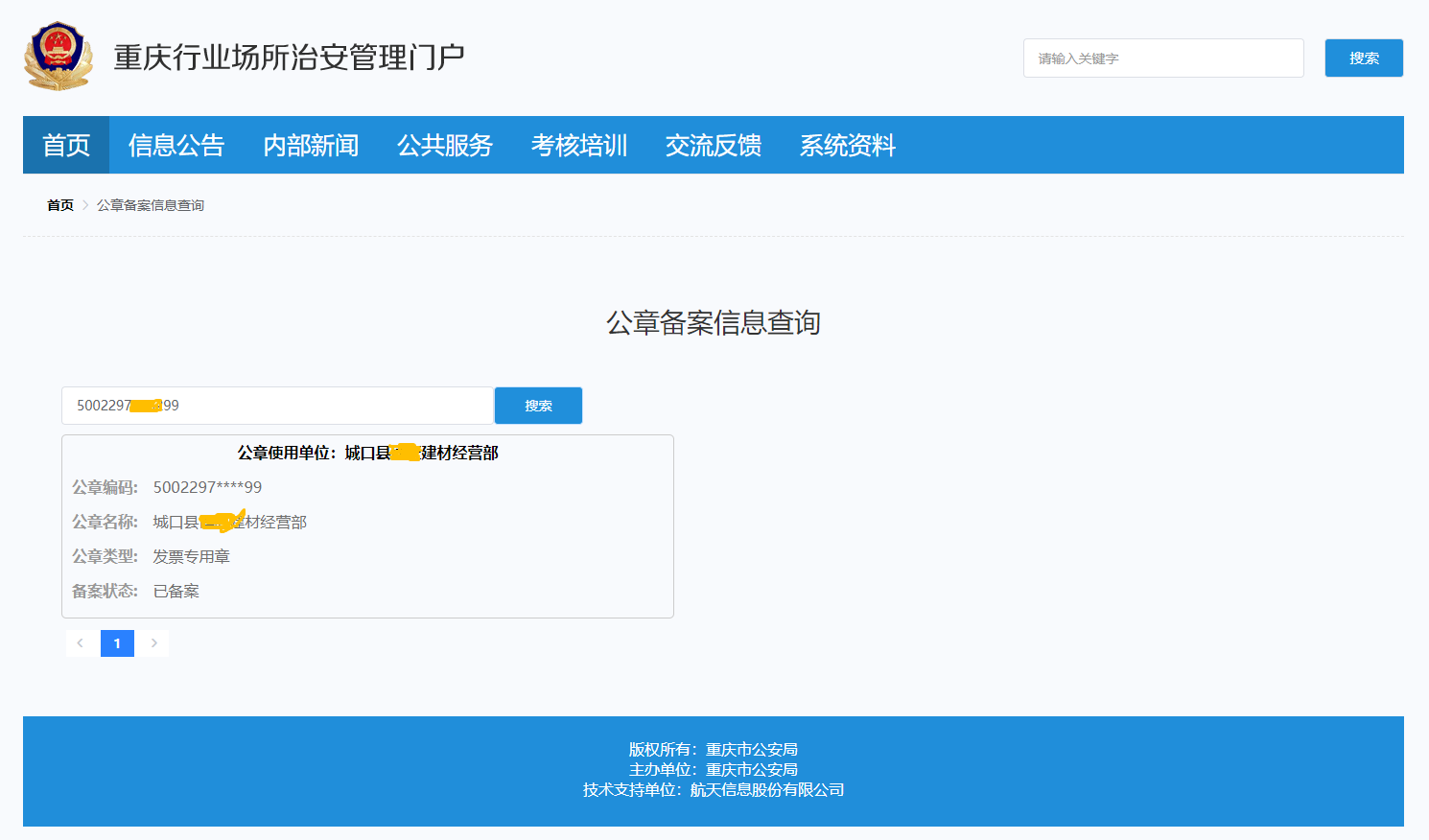 3、如该单位经“重庆市行业场所治安管理门户网站”或“物电一体印章管理系统”办理过印章录入、刻制、备案,点击“搜索”后,会显示印章的详细信息,如上图。