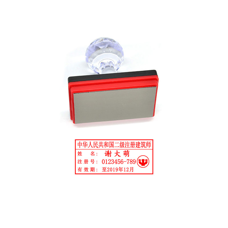 二级注册建筑师执业印章,印模颜色为红色,由中华人民共和国(注册专业名称)、姓名、注册号、有效期和徽标5部分组成。